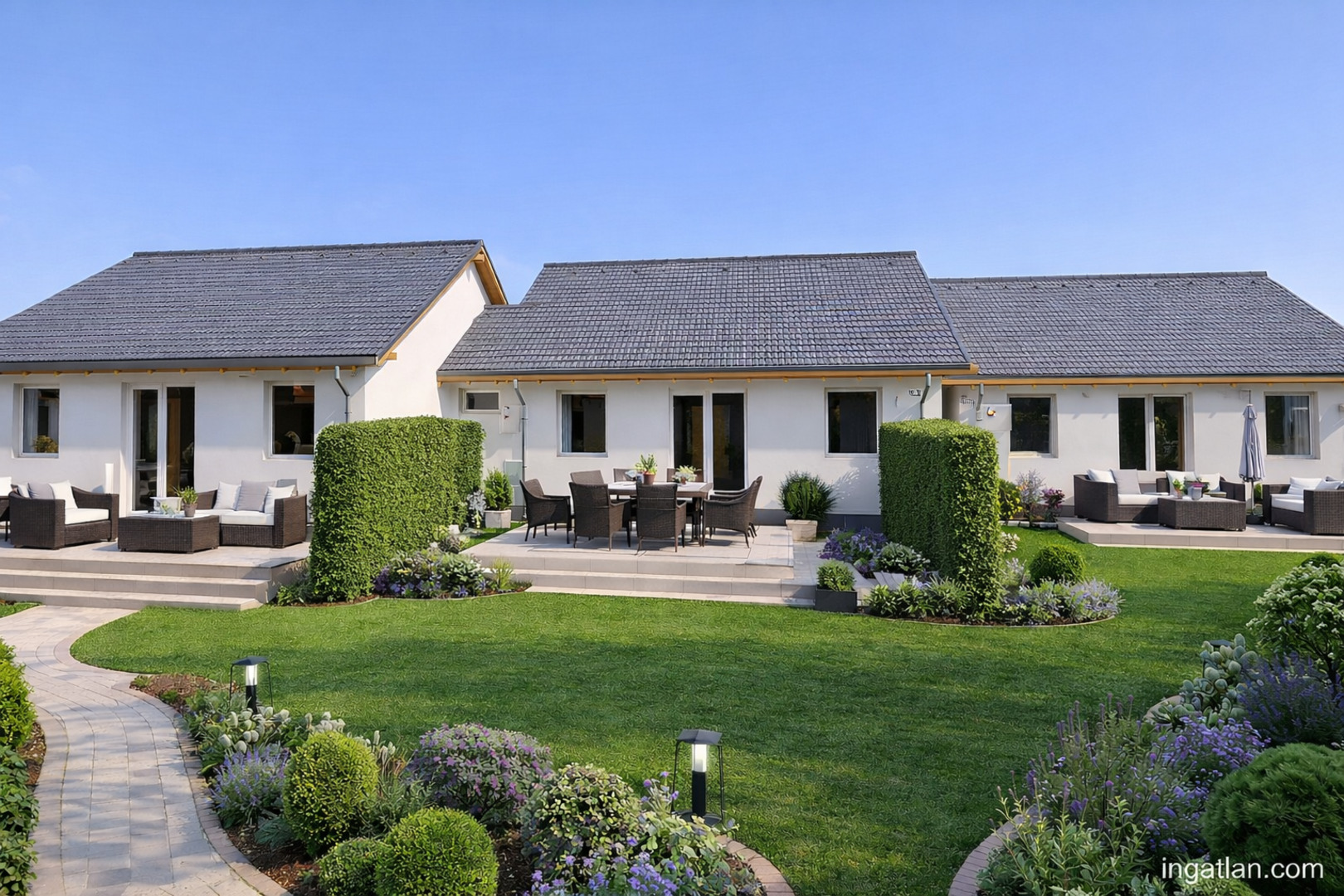A lakások elrendezése: tároló, előtér, kert és teraszkapcsolatos amerikai konyhás étkező nappali, 3 hálószoba, fürdőszoba és külön wc.